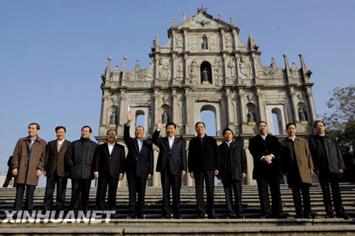2009年1月11日,時任國家副主席習近平到澳門著名文化遺址大三巴參觀。這是參觀后習近平與澳門特別行政區(qū)行政長官何厚鏵(左五)等合影。新華社記者周磊 攝