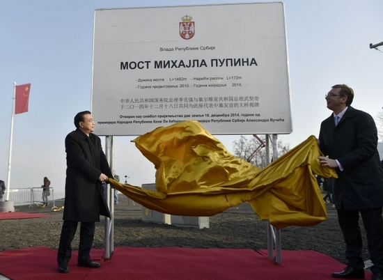 。ǹ藦(qiáng)總理與武契奇總理共同為大橋竣工紀(jì)念牌揭幕,攝影記者:中新社劉震)