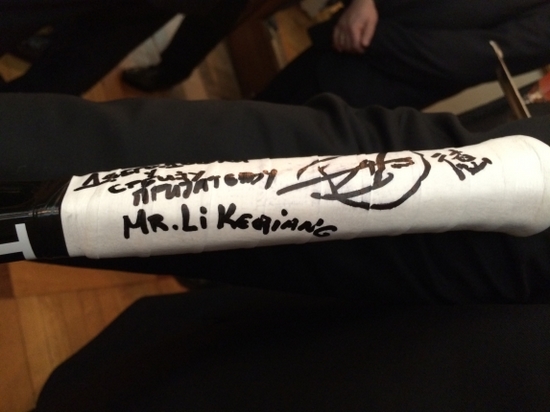 (小德的叔叔贈(zèng)給克強(qiáng)總理一個(gè)小德簽名的網(wǎng)球拍,攝影記者:饒愛(ài)民)