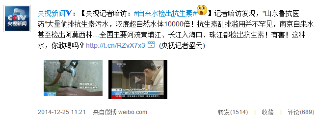 原標(biāo)題:央視記者暗訪:自來水檢出抗生素