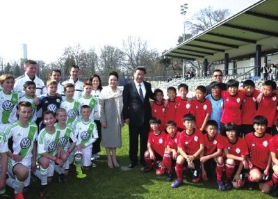 、2014年3月29日,習(xí)近平和夫人看望在德國參加訓(xùn)練的志丹少年足球隊隊員。