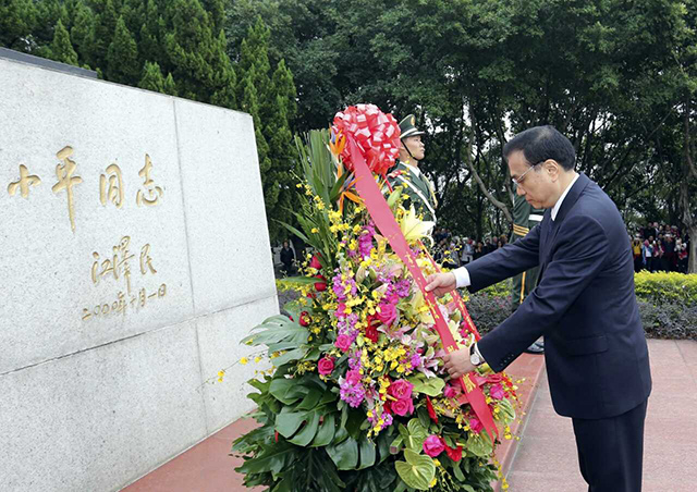 在群眾一路簇?fù)硐,總理來到鄧小平銅像前,并與現(xiàn)場群眾一同向銅像敬獻(xiàn)花籃。