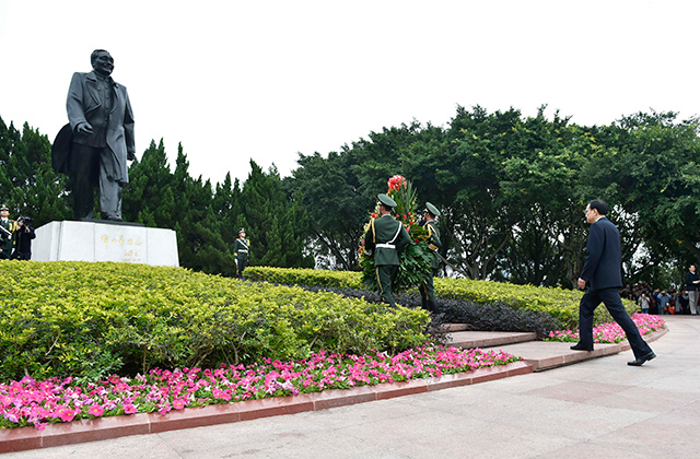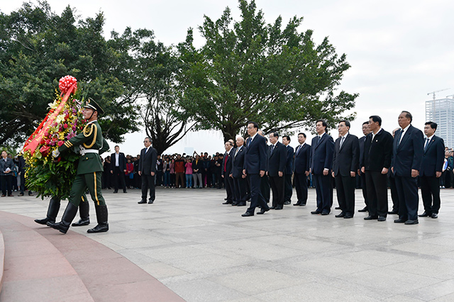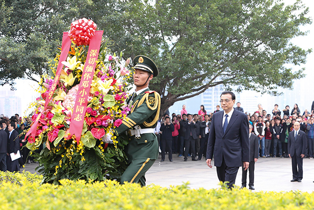 李克強(qiáng)走上臺階,在6米高的小平銅像前肅立,整理花籃緞帶,并向銅像深深鞠躬。隨后,他與廣東省、深圳市領(lǐng)導(dǎo)、部分老同志及隨行部門負(fù)責(zé)人向小平銅像三鞠躬。