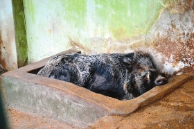 1月14日,動(dòng)物園圈內(nèi)沒(méi)有鋪墊物,野豬躺在食槽內(nèi)。本報(bào)記者劉平攝