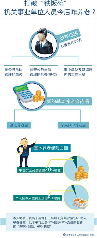這幾天,近4000萬機關(guān)事業(yè)單位工作人員被這兩個問題深深地困擾。上周,國務(wù)院下發(fā)了《關(guān)于機關(guān)事業(yè)單位工作人員養(yǎng)老保險制度改革的決定》(以下簡稱《決定》),從2014年10月1日起,對機關(guān)事業(yè)單位工作人員養(yǎng)老保險制度進行改革。這意味著,機關(guān)事業(yè)單位將建立與企業(yè)相同的養(yǎng)老保險制度,進入繳費時代。