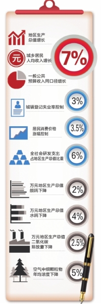 2015年,全市經(jīng)濟(jì)社會發(fā)展主要預(yù)期目標(biāo)是,地區(qū)生產(chǎn)總值增長7%左右;城鎮(zhèn)登記失業(yè)率控制在3%以內(nèi);城鄉(xiāng)居民人均收入實際增長7%;居民消費(fèi)價格漲幅控制在3.5%左右;一般公共預(yù)算收入同口徑增長7%以上;全社會研發(fā)支出占地區(qū)生產(chǎn)總值比重6%左右;萬元地區(qū)生產(chǎn)總值能耗、水耗和二氧化碳排放量分別下降2%、4%和2.5%,空氣中細(xì)顆粒物年均濃度下降5%左右。