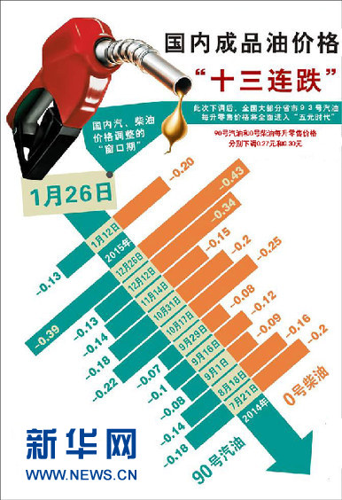新華網(wǎng)北京1月26日電(索煒 郝多)26日,國家發(fā)展改革委發(fā)出通知,決定自1月27日零時起下調(diào)汽、柴油限價,每噸汽、柴油分別下調(diào)365元和350元,折算到90號汽油和0號柴油(全國平均)每升零售價格分別下調(diào)0.27元和0.30元。調(diào)整后北京的92號汽油每升為5.79元。