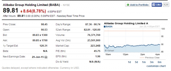 多重因素作用下,阿里巴巴集團在今日收盤時股價大跌8.64美元至89.81美元,跌幅達8.78%,市值蒸發(fā)近215億美元(約合1343億人民幣)。
