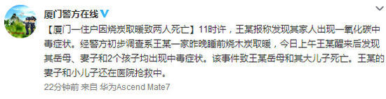人民網(wǎng)北京1月30日電 據(jù)廈門公安局微博消息,今日11時許,王某報稱發(fā)現(xiàn)其家人出現(xiàn)一氧化碳中毒癥狀。經(jīng)警方初步調(diào)查系王某一家昨晚睡前燒木炭取暖,今日上午王某醒來后發(fā)現(xiàn)其岳母、妻子和2個孩子均出現(xiàn)中毒癥狀。該事件致王某岳母和其大兒子死亡。王某的妻子和小兒子還在醫(yī)院搶救中。