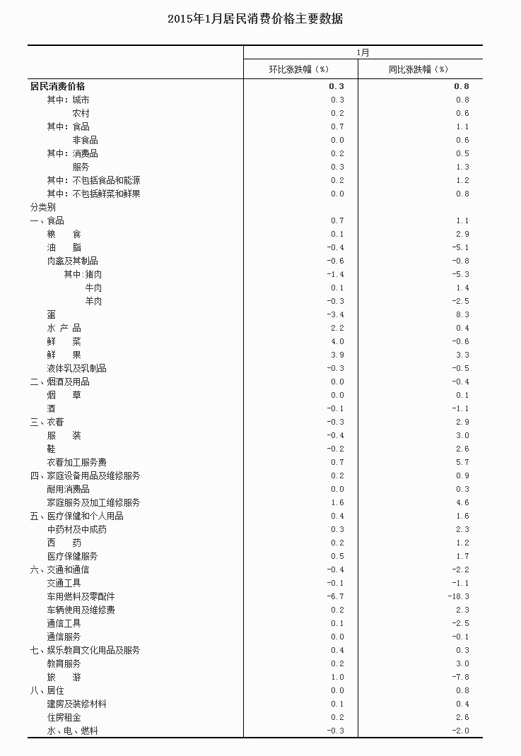 央廣網(wǎng)北京2月10日消息 據(jù)國家統(tǒng)計局消息,2015年1月份,全國居民消費價格總水平同比上漲0.8%。其中,城市上漲0.8%,農(nóng)村上漲0.6%;食品價格上漲1.1%,非食品價格上漲0.6%;消費品價格上漲0.5%,服務(wù)價格上漲1.3%。