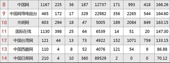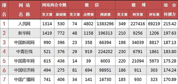 排行說明:本排行監(jiān)測時間為2015年3月6日零時至3月10日15時。本排行是根據(jù)中青華云監(jiān)測系統(tǒng)監(jiān)測數(shù)據(jù),對14家中央新聞網(wǎng)站“兩會”專題的發(fā)文量、原創(chuàng)量,以及各網(wǎng)站旗下一個官方微博、一個官方微信公眾號的發(fā)文量、閱讀量、評論量、轉(zhuǎn)發(fā)量、點(diǎn)贊量等,通過統(tǒng)計技術(shù)取自然對數(shù)的方法去量綱,根據(jù)加權(quán)處理,計算出各網(wǎng)站“兩會”報道的傳播力得分。