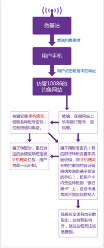 從“10086積分兌換”詐騙的流程來(lái)看,詐騙者已經(jīng)實(shí)現(xiàn)了專業(yè)化的鏈條分工,偽基站發(fā)送、釣魚網(wǎng)站建設(shè)和維護(hù)、銀行支付流程的弱點(diǎn)研究、得手后的洗錢和取錢,分別屬于不同的人群。洗錢、匿名電話卡、銀行黑卡、盜號(hào)木馬在某些詐騙發(fā)達(dá)的地區(qū)已有完整提供。