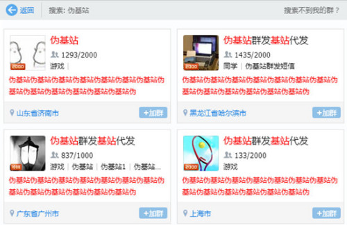 除了傳統(tǒng)詐騙地區(qū)的內(nèi)部交易之外,我們對(duì)網(wǎng)絡(luò)信息搜索發(fā)現(xiàn),詐騙者之間也在利用QQ群等工具進(jìn)行灰色交易,例如,偽基站擁有者通過(guò)QQ群出售服務(wù),按照發(fā)送條數(shù)、或者以小時(shí)為單位計(jì)價(jià)。這些專業(yè)分工、流水線式詐騙,使得整個(gè)黑色鏈條的運(yùn)行效率大大提高,也增加了警方打擊的難度。