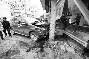 一輛橘黃色的雷諾SUV車頭頂在門面的墻柱和另一扇鋼網(wǎng)門上,車頭撞擊和碰擦后慘不忍睹,引擎蓋翹起,車內(nèi)司機(jī)和副駕駛前面的兩個(gè)氣囊都打開了。廚具店的墻柱被正面撞擊,墻體開裂,墻上的卷簾門軌槽被撞成麻花,店門口散落著大塊的碎玻璃。店主看著眼前景象一臉無助,店內(nèi)的部分廚具物品也被撞成一片狼藉。