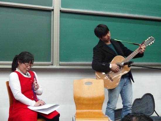 在現(xiàn)場十幾名讀者分別朗誦完余秀華的詩歌之后,詩人自己也在鐘立風(fēng)吉他的伴奏下深情朗誦起來。而鐘立風(fēng)則將《月光落在左手上》的首篇《我愛你》用吉他彈唱出來。隨后,李健也通過視頻,分享了讀余秀華詩歌的感悟。