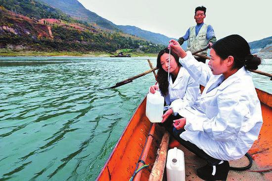 白河縣環(huán)保局技術(shù)人員在漢江提取水樣