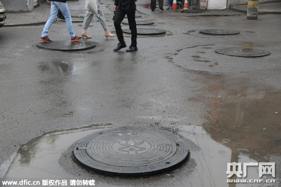 2015年4月28日,山東濟南,在濟南歷下區(qū)縣東巷中段,數(shù)十井蓋被拔高,由于密集排在路上,放學回家的家長騎車帶著孩子途徑此路,都要拐來拐去躲避障礙,如同考駕!奥房肌。一位家長稱,此路附近有兩所學校,每天有數(shù)百學生要途徑此路上學,雖然天氣暖和后,到了路面和橋面修缺補坑的時候,但放學路上存在安全隱患。