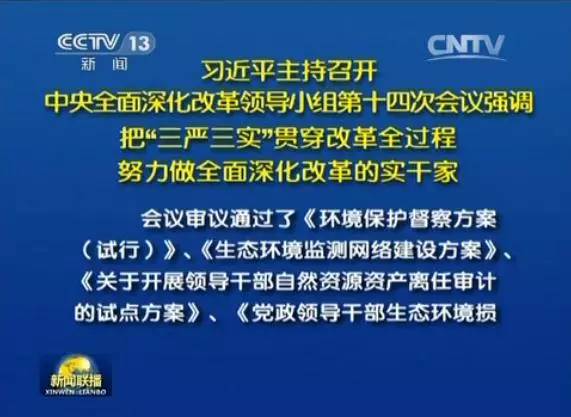 會議審議通過了《環(huán)境保護(hù)督察方案(試行)》、《生態(tài)環(huán)境監(jiān)測網(wǎng)絡(luò)建設(shè)方案》、《關(guān)于開展領(lǐng)導(dǎo)干部自然資源資產(chǎn)離任審計(jì)的試點(diǎn)方案》、《黨政領(lǐng)導(dǎo)干部生態(tài)環(huán)境損害責(zé)任追究辦法(試行)》、《關(guān)于推動國有文化企業(yè)把社會效益放在首位、實(shí)現(xiàn)社會效益和經(jīng)濟(jì)效益相統(tǒng)一的指導(dǎo)意見》。