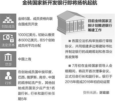 金磚國家已宣布成立新開發(fā)銀行,并建立應急儲備安排。本次領導人會晤期間,新開發(fā)銀行準備召開首次理事會,金磚國家央行行長準備簽署應急儲備安排五國央行協(xié)議。