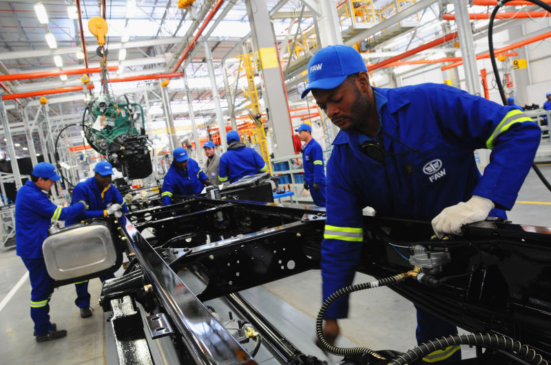 在南非東開普省曼德拉灣市,工人在中國一汽南非工廠生產(chǎn)線上工作。(新華社發(fā))