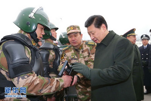 2013年1月29日,習近平在武警北京市總隊十三支隊察看部隊裝備。新華社記者 李剛 攝