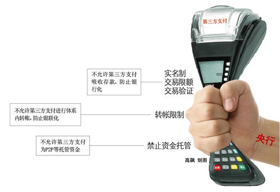 該意見稿釋放的一個核心信號,即斷絕了第三方支付銀行化的道路!爸Ц毒褪侵Ц,支付機構不能‘銀行化’、‘銀聯(lián)化’,卸下資金沉淀與清算功能。銀行管支付結算,支付機構補充以小額支付,銀聯(lián)則管清算!睎|方證券銀行業(yè)首席分析師王劍告訴時代周報記者。