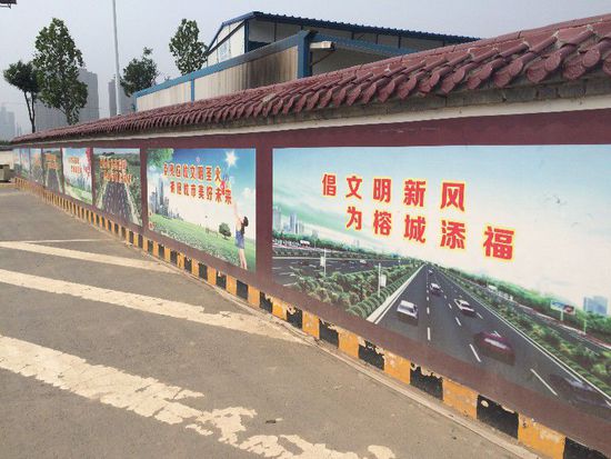 8月12日上午,在咸通北路和文林西路交界處的文林西路西延工程項(xiàng)目部外墻上,華商記者找到市民反映的那些外省宣傳標(biāo)語。30多米長的文化墻上依次貼了10張宣傳海報(bào)。 “山水古蒲陽,文明新應(yīng)城”、“倡文明新風(fēng),為榕城添!、“富水湖畔樹正氣 ,膏都鹽海倡新風(fēng)”等,這些海報(bào)的背景圖均為美麗的城市風(fēng)景圖,看起來頗為美觀大方,只是有多達(dá)8張海報(bào)上的地名都是外省的,著實(shí)讓人有點(diǎn)摸不著頭腦。