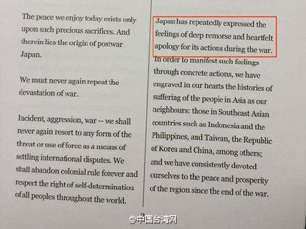 日本首相安倍晉三在其發(fā)表的戰(zhàn)后70周年談話中寫入了“道歉”。安倍在二戰(zhàn)紀念聲明中說,日本已一再表達了懊悔和歉意;先前內(nèi)閣的立場依舊不可動搖;必須從歷史中學到教訓;不應重演恐怖的戰(zhàn)爭;對戰(zhàn)爭中死者表達真切的哀悼。