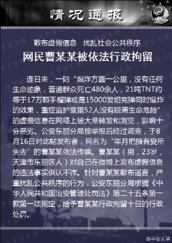 中新網8月17日電 據天津市公安局官方微博消息,近日一則“爆炸方圓1公里,沒有任何生命跡象,普通群眾死亡480余人”的虛假消息在網上大量流傳。經調查,天津警方傳喚了網民曹某某(男,23歲,天津東麗區(qū)人),其對在微博上散布虛假信息供認不諱,警方決定將曹某某依法行政拘留十日。