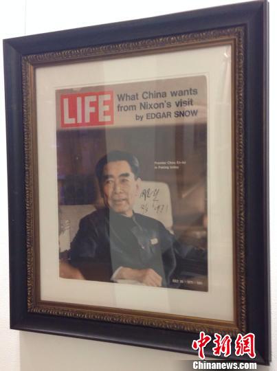 展覽上,愛因斯坦、斯大林、丘吉爾、宋慶齡、羅斯福等人的影像和手跡逐一亮相。其中,周恩來總理在《生活》雜志上的手跡格外引人注目。這份《生活》雜志于1971年7月刊發(fā),上面登載了周恩來總理發(fā)布的美國總統(tǒng)尼克松將于次年5月訪問中國的消息,是國外對(duì)此事最早的報(bào)道之一,見證中美兩個(gè)大國由對(duì)立走向交流。1971年12月3日,周恩來在這份《生活》雜志上簽名作為紀(jì)念。