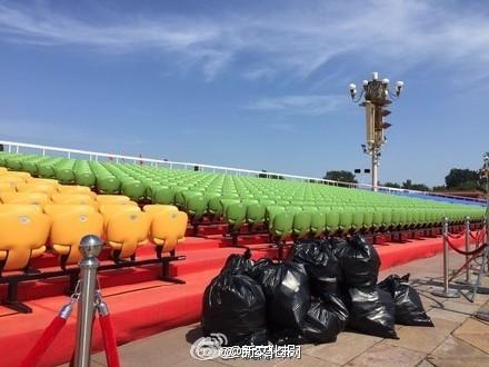 閱兵觀禮臺嘉賓撤離后現(xiàn)場整潔 垃圾全扔塑料袋