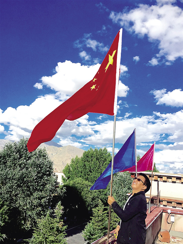 圖為西藏文物總店的工作人員在房頂上掛國旗。記者 格桑倫珠 攝