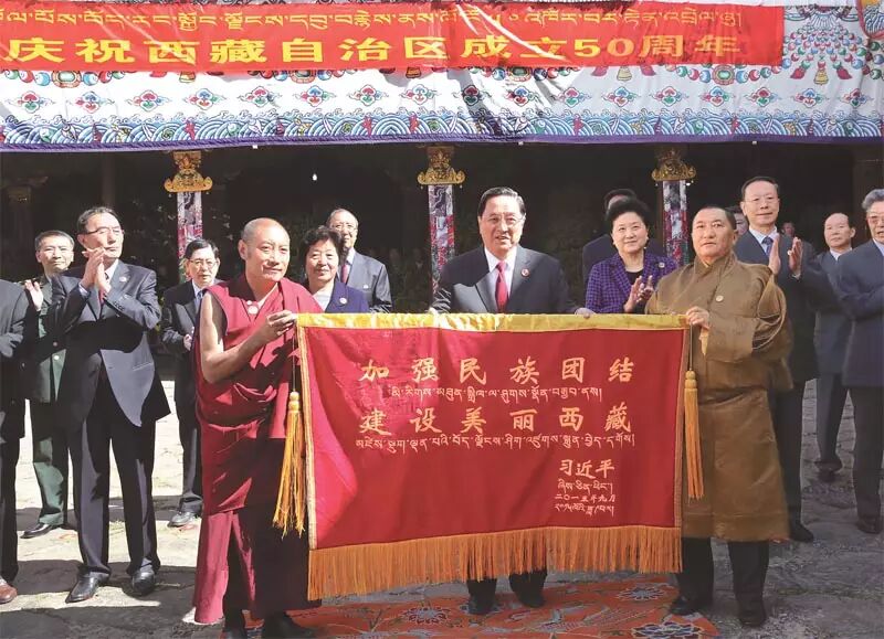 9月7日上午,中共中央政治局常委、全國政協(xié)主席、中央代表團團長俞正聲來到大昭寺,親切看望慰問西藏宗教界愛國人士,向全區(qū)寺廟贈送由習近平總書記親筆題寫的“加強民族團結(jié) 建設(shè)美麗西藏”賀幛和琺瑯彩平安瓶。