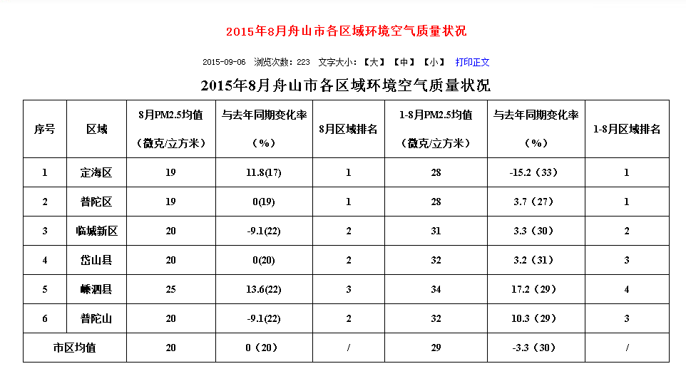 據(jù)介紹,此次長(zhǎng)三角區(qū)域25個(gè)城市空氣質(zhì)量達(dá)標(biāo)天數(shù)比例在45.2%~100%之間。其中舟山市各區(qū)域空氣質(zhì)量排名均比較靠前,定海區(qū)、普陀區(qū)8月區(qū)域排名均第一。