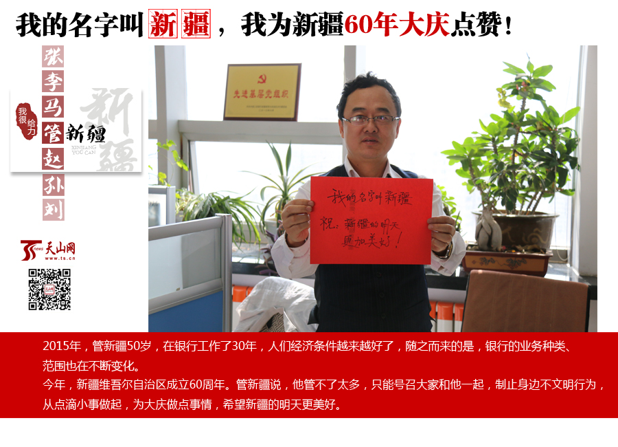 管新疆:今年是自治區(qū)成立60周年,就讓我們大家攜起手來,制止不文明行為,從點滴做起,讓新疆的明天更加美好!在自治區(qū)成立60周年之際,我祝愿咱們大美新疆更加美麗、人們的生活越來越好!