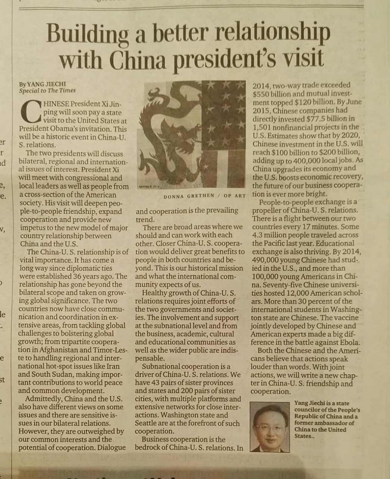 人民網(wǎng)西雅圖9月21日電 9月21日,美國華盛頓州英文大報(bào)《西雅圖時(shí)報(bào)》發(fā)表中國國務(wù)委員楊潔篪題為《習(xí)近平主席訪美,構(gòu)建更好中美關(guān)系》的署名文章。