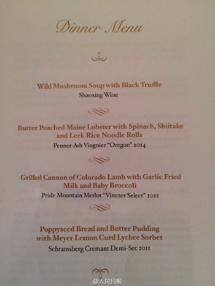 【白宮國宴菜單提前曝光】黑松露野生菌湯+黃油煮龍蝦菠菜+香菇韭菜米線卷+科羅拉多烤羊肉配奶煎大蒜+紹興黃酒。