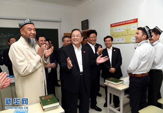9月25日,正在烏魯木齊參加新疆維吾爾自治區(qū)成立60周年慶;顒(dòng)的中共中央政治局常委、全國政協(xié)主席、中央代表團(tuán)團(tuán)長俞正聲率中央代表團(tuán)部分成員來到新疆伊斯蘭教經(jīng)學(xué)院,看望慰問宗教界人士代表。新華社記者 饒愛民 攝