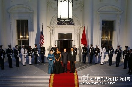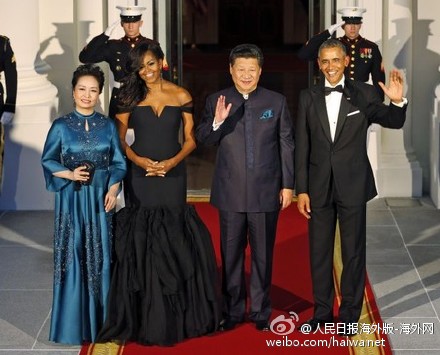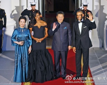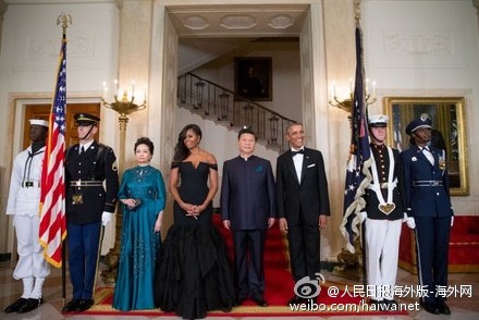 【奧巴馬在白宮東廳設(shè)國宴招待習(xí)近平夫婦】據(jù)美聯(lián)社報(bào)道,奧巴馬總統(tǒng)夫婦在9月25日晚邀請中國國家主席習(xí)近平及夫人彭麗媛參加在白宮東廳舉行的國宴,四人在東廳門口亮相。