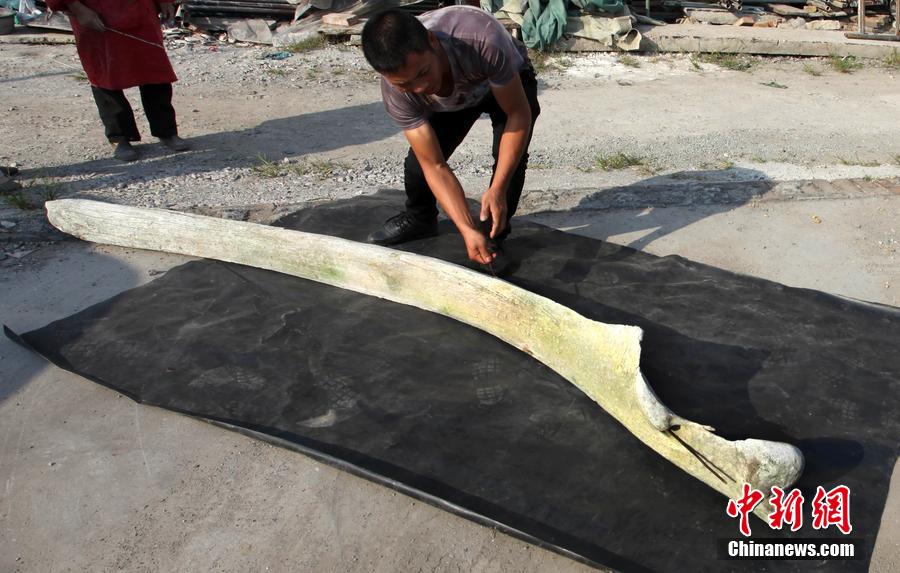 10月12日,浙江溫嶺,松門鎮(zhèn)松南村,漁民張國(guó)云珍藏著一根三米長(zhǎng)的“魚刺”,這根魚刺是20年前他出海打魚時(shí)從魚網(wǎng)里撿到的,2.92米長(zhǎng),稱重45公斤。 圖片來(lái)源:CFP視覺(jué)中國(guó)