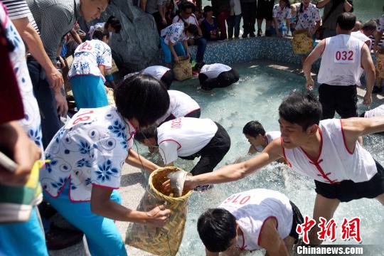 參賽運(yùn)動員進(jìn)行稻田抓魚比賽!⑽臉(biāo) 攝