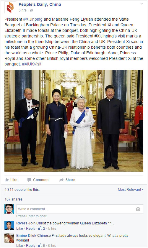人民網(wǎng)北京10月22日電 應(yīng)英國女王伊麗莎白二世邀請(qǐng),中國國家主席習(xí)近平10月19日至23日對(duì)英國進(jìn)行國事訪問。人民日?qǐng)?bào)利用臉譜、推特、優(yōu)兔等外文海外社交媒體賬號(hào)實(shí)時(shí)聚焦訪問行程,圖片、文字、視頻等報(bào)道受到全世界網(wǎng)民高度關(guān)注,海外網(wǎng)民紛紛點(diǎn)贊、留言。