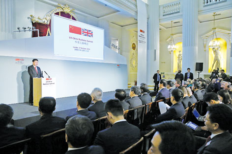 10月21日,國家主席習(xí)近平和英國首相卡梅倫共同出席在倫敦金融城舉行的中英工商峰會并致辭。新華社記者龐興雷攝