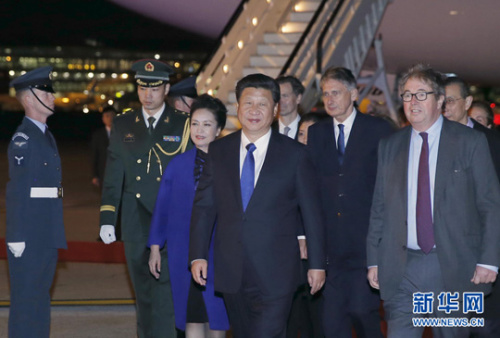 10月19日,中國(guó)國(guó)家主席習(xí)近平抵達(dá)倫敦,開(kāi)始對(duì)英國(guó)進(jìn)行國(guó)事訪問(wèn)。英國(guó)女王代表胡德子爵、外交大臣哈蒙德等到機(jī)場(chǎng)迎接習(xí)近平和夫人彭麗媛。新華社記者 鞠鵬 攝