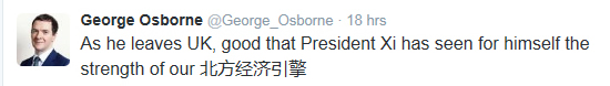 英國(guó)財(cái)政大臣喬治·奧斯本在推特上刊文表示,習(xí)近平主席已經(jīng)結(jié)束訪英行程,他希望英國(guó)的“北方經(jīng)濟(jì)引擎”能給習(xí)近平主席留下深刻的印象。