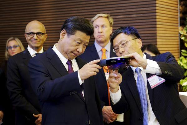 2015年9月23日,國(guó)家主席習(xí)近平在西雅圖附近的雷德蒙德市參觀美國(guó)微軟公司總部,圖為習(xí)近平在體驗(yàn)全息眼鏡!≠Y料圖
