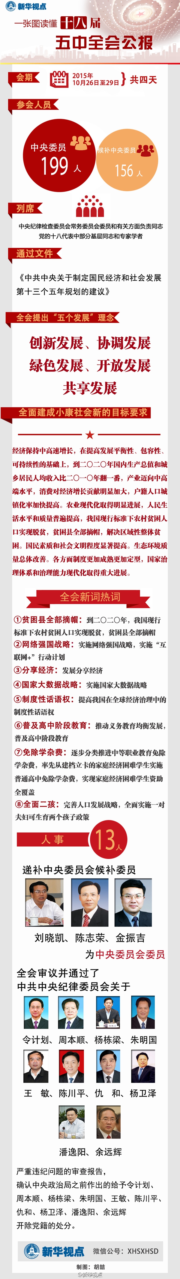 五中全會公報中的10條干貨,1、全會聽取和討論了習(xí)近平受中央政治局委托作的工作報告,審議通過了《中共中央關(guān)于制定國民經(jīng)濟和社會發(fā)展第十三個五年規(guī)劃的建議》。2、全會按照黨章規(guī)定,決定遞補中央委員會候補委員劉曉凱、陳志榮、金振吉為中央委員會委員。