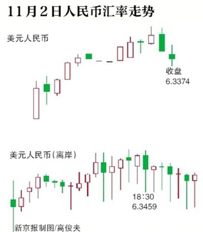 昨日開盤后,內(nèi)外人民幣匯率開始回落。截至昨日收盤,在岸人民幣匯率報(bào)6.3374,下跌193點(diǎn),跌幅0.3055%;截至18∶30,離岸人民幣報(bào)6.3459,下跌241點(diǎn),跌幅0.3812%。