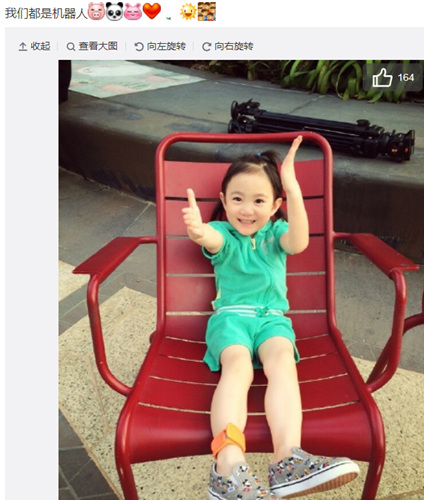 中新網(wǎng)11月5日電 今天上午,體操奧運(yùn)冠軍李小鵬在微博上曬出了女兒奧莉的一組賣萌照。照片中可愛的奧莉坐在椅子上,用胳膊和手臂擺起了機(jī)器人的造型,一雙大大的眼睛十分可愛。