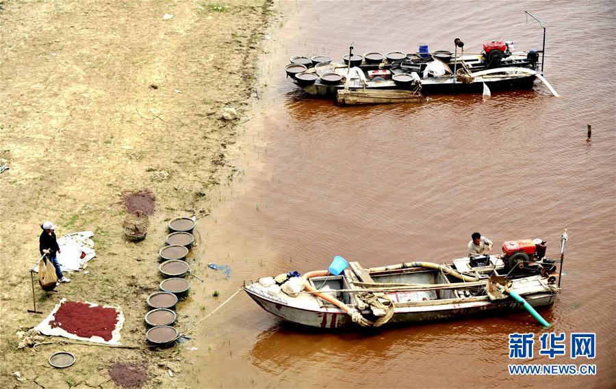 兩條打撈魚蟲的船只?吭谧兩奶旖颡毩鳒p河岸邊(2014年5月25日攝)。新華社記者岳月偉攝
